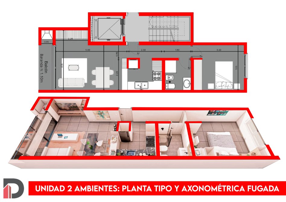 1) UNIDAD A) DEPARTAMENTO 2 AMBIENTES CON DISPOSICIÓN FRENTE Y UNIDAD B) CON DISPOSICIÓN CONTRAFRENTE: